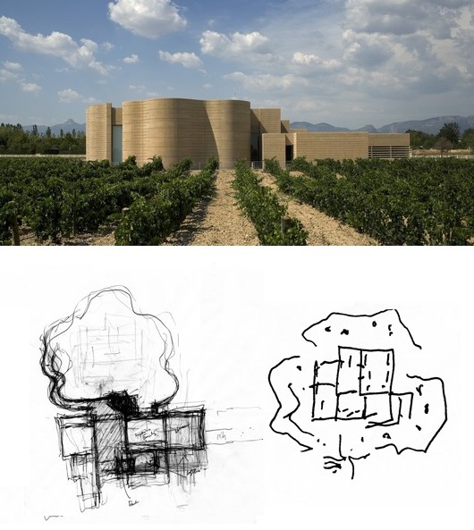 No pretende interferir en el paisaje sino que se inspira en él, al elegir las dramáticas masas de los Mallos de Riglos o el Salto de Roldán, como forma específica de la naturaleza oscense. La urbanización exterior y su tratamiento paisajístico mantiene su condición agrícola, Moneo piensa en un jardín como un campo cultivado, donde del terreno emerge un volumen ondulado y fluido que nace de un foso/alberca dotándolo de cierto carácter insular.